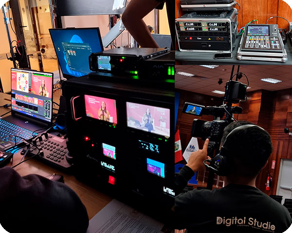 Utilizamos cámaras de calidad profesional conectadas a switchers de video en vivo para lograr una realización dinámica y profesional, con múltiples ángulos y transiciones en tiempo real. Cada señal se gestiona desde estaciones de trabajo optimizadas exclusivamente para streaming, con codificación por hardware que asegura estabilidad, eficiencia y calidad en todo momento.