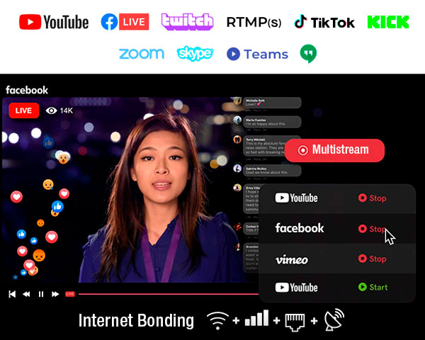 Transmitimos a plataformas como YouTube, Facebook, TikTok o Kick mediante el protocolo RTMPS, ampliamente utilizado para streaming en redes sociales. Para conexiones privadas punto a punto, empleamos el protocolo SRT, ideal para enlaces directos entre sedes o centros de producción. Además, también transmitimos a plataformas de videoconferencia como Zoom, Microsoft Teams o Google Meet, según las necesidades del evento.