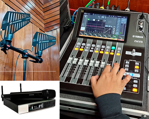 Una transmisión de alto nivel requiere imagen y sonido impecables. Por ello, usamos sistemas de audio profesional Yamaha y micrófonos inalámbricos Sennheiser digitales con antenas direccionales, logrando voces nítidas y estables. Con tecnología Dante, integramos el audio por red IP para sincronizarlo con el video y optimizar la experiencia en sitio y en línea.